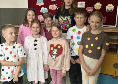 Mnóstwo kolorowych krop, kropek, kropeczek zagościło w szkolnych salach i na korytarzach, ponieważ uczniowie i nauczyciele w tym dniu przyszli ubrani w kropki.